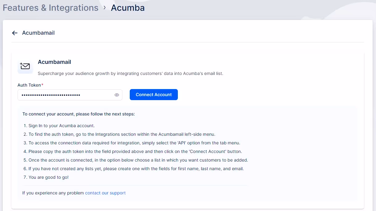 Next, a new page will open with instructions on how to link your Acumbamail account. You’ll need to add the Acumbamail auth token and click “Connect Account” to initiate the setup process.