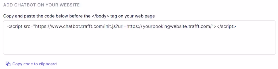 If you’re utilizing an iframe or wish to integrate the Quickly Booked AppChatbot on your personal website instead of displaying it on your booking page, you can copy and paste the following code just before the </body> tag on your webpage.