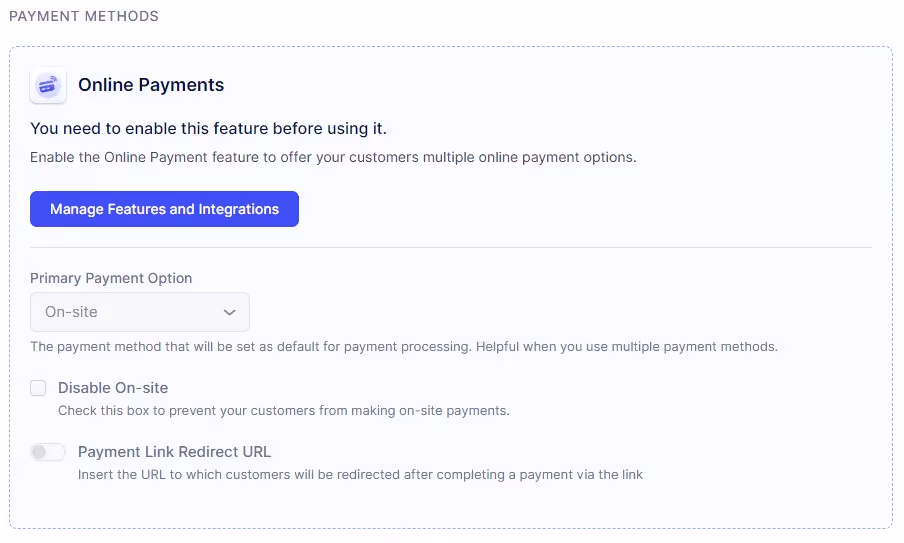 To use Online Payment methods, you first need to enable this feature in the Features & Integrations page.