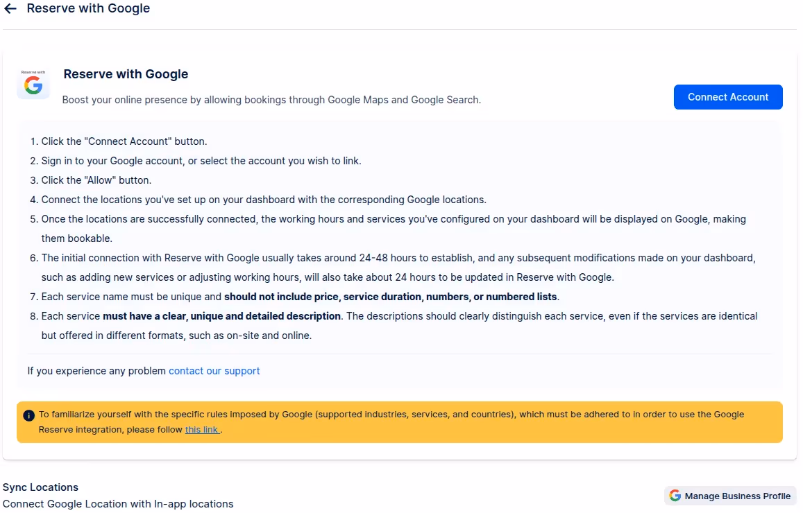Here you will be able to connect to your Google Business account and link Quickly Booked App location with your business location.