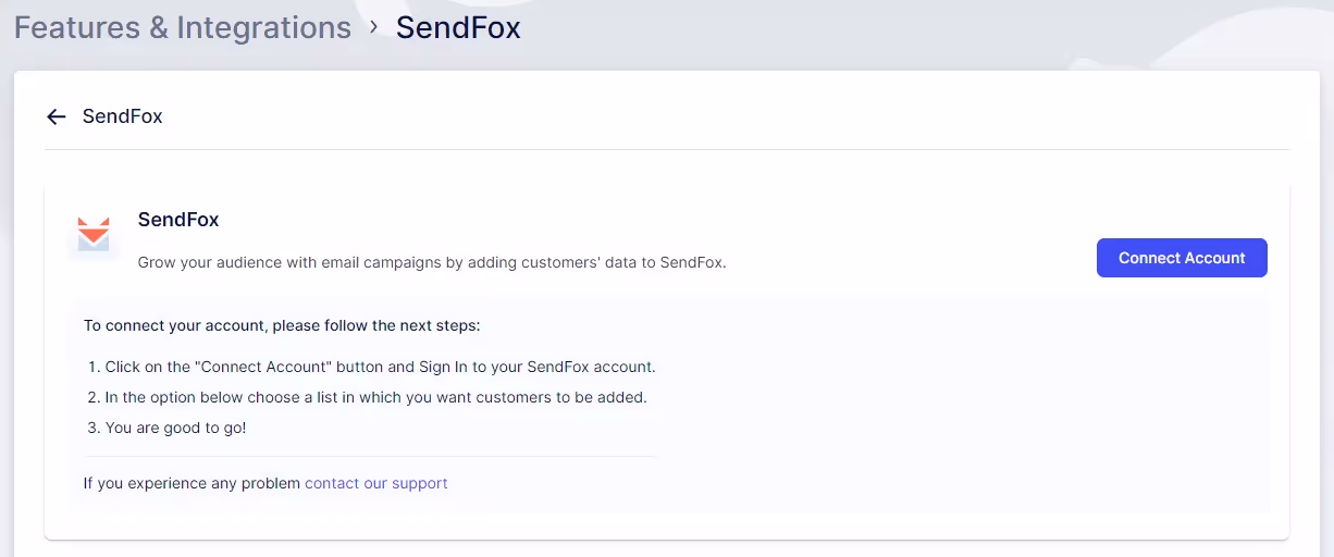 A new page will open with instructions on how to link your SendFox account. Begin by clicking the “Connect Account” button to initiate the setup process.
